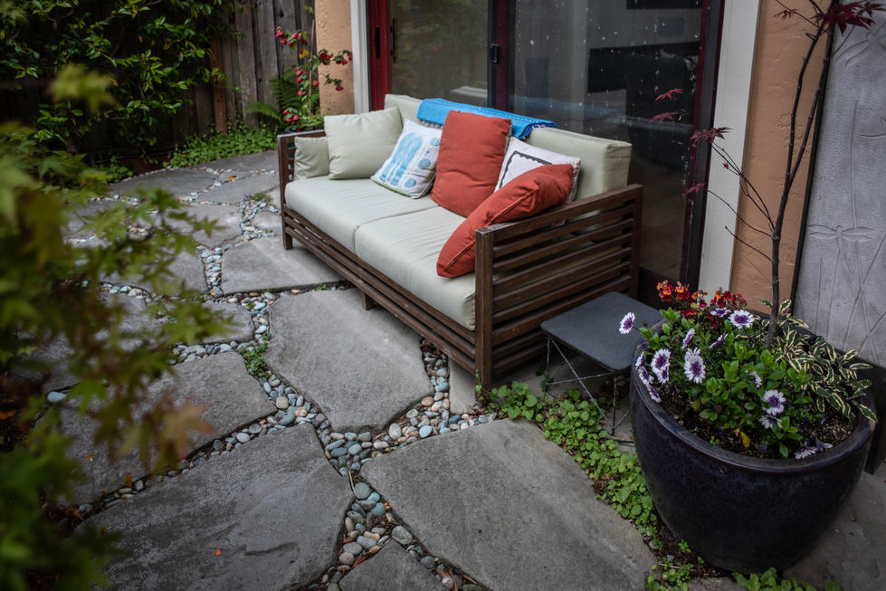 This charming front yard on the Westside of Santa Cruz features a wide variety of colorful drought tolerant plants that encircle a private seating area, perfect for morning coffee or an afternoon cocktail.
