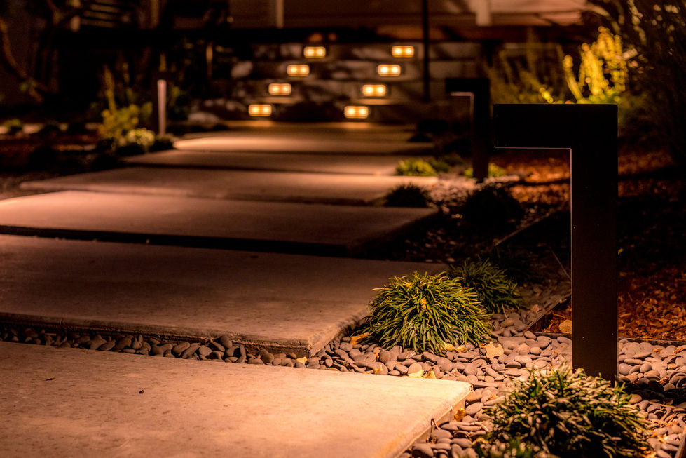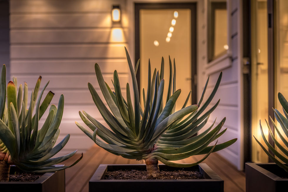 Clean lines and angles come to life by day with a simplified, low-water plant palette and by night with dramatic lighting and distinct low-voltage lighting features.