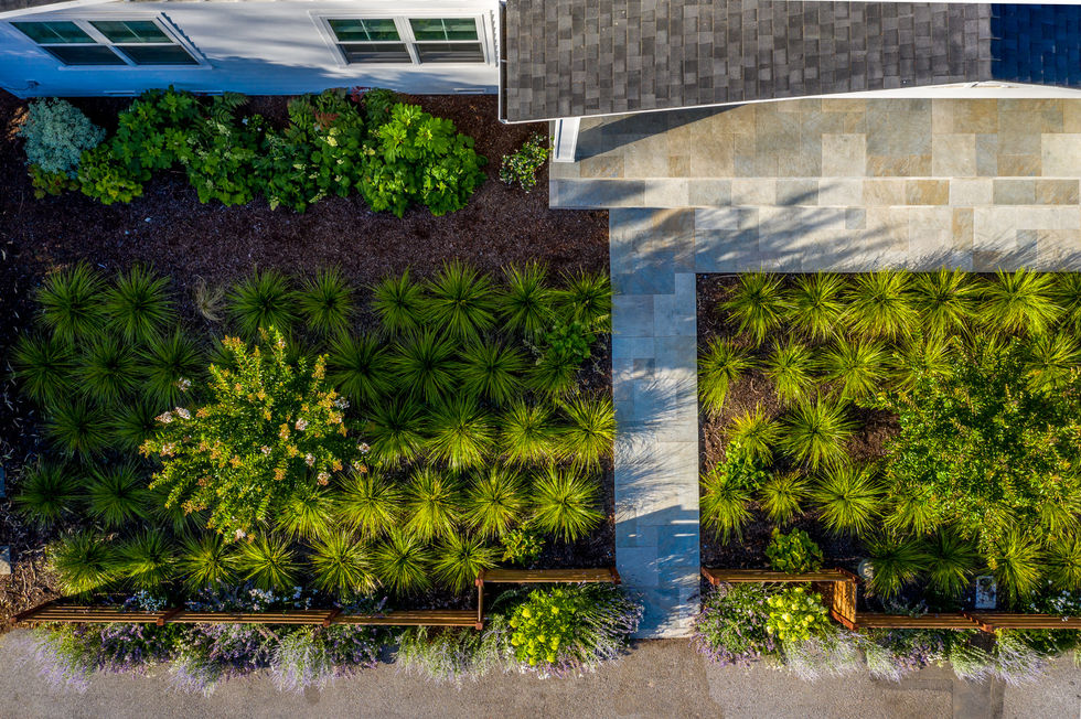 The front yard feels lush and vibrant with a drought tolerant Lomandra meadow and low-water perennial border. Custom veggie boxes and fire pit in back create a great gathering space for family and fun.